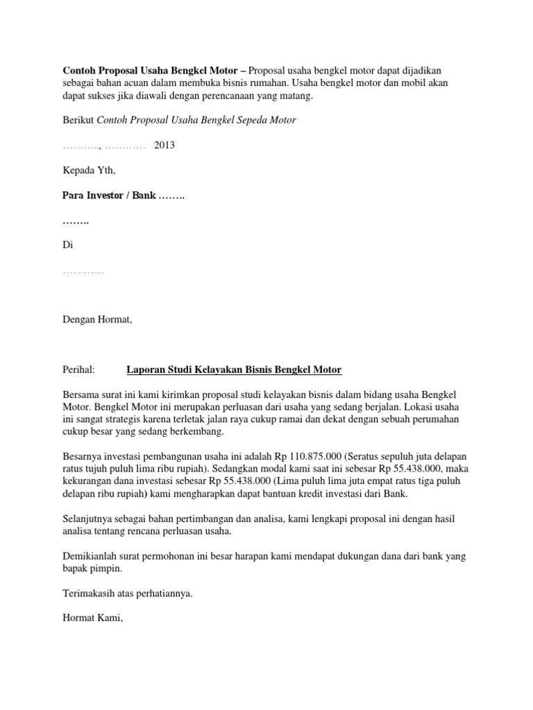 Contoh Proposal Usaha Bengkel Motor from imgv2-1-f.scribdassets.com Untuk kamu yang sedang merintis usaha kerjinan dan sedang membutuhkan dana, berikut proposal bisnis yang bisa kamu ajukan kepada investor. Contoh proposal usaha di atas dapat anda edit sesuai dengan jenis usaha kelompok maupun estimasi dana yang dibutuhkan dan dalam membuat proposal bantuan dana usaha juga harus dilampirkan dengan lembar pengesahan dan susunan pengurus kelompok usaha atau anggota.jika ada kesalahan dalam contoh proposal di atas atau ada yang kurang saya mohon. Usaha minuman ini juga termasuk ke dalam salah satu usaha yang dapat mendulang banyak keuntungan. Contoh proposal usaha dan bisnis lengkap, mulai usaha kuliner, pizza, cafe, kerajinan, warung kopi, restoran, bisnis online hingga proposal bisnis cucian mobil. Contoh proposal usaha sablon dan percetakan. Contoh proposal pengadaan toserba di kopontren. Proposal usaha/business plan adalah panduan untuk menjalankan dan mengembangkan bisnis anda. Roti bakar venak jenis usaha: