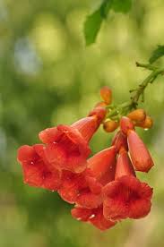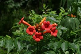 The trumpet creeper, campsis radicans, is a rapid growing clinging vine that produces bright red orange trumpet shaped flowers up to 3 inches long.